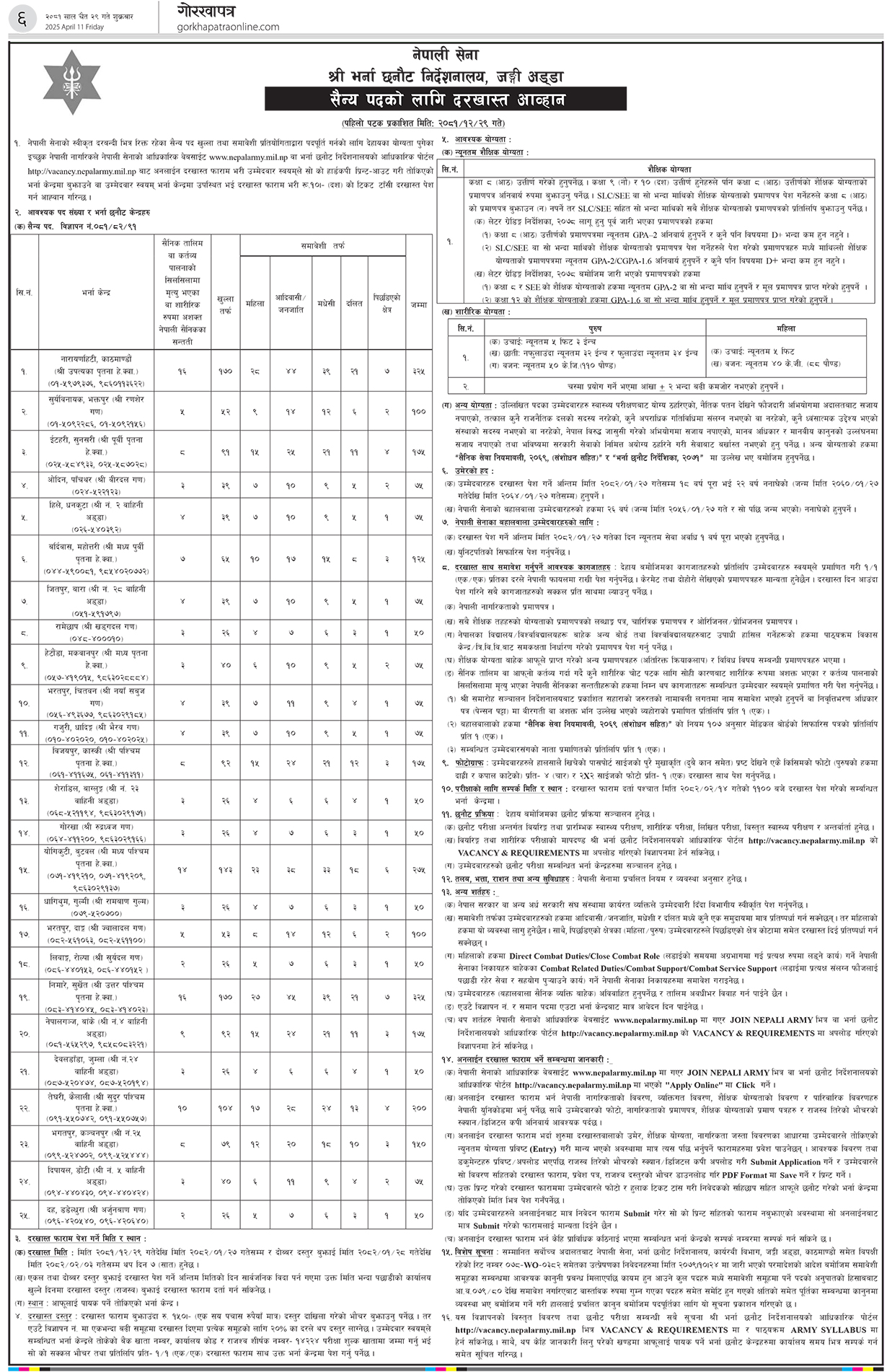 नेपाली सेनाले सामान्य सैनिक पदमा सबैभन्दा बढी जनशक्ति माग गरेको छ, जसमा कुल २३०० जना सैनिक भर्ती हुनेछन्। यसका अतिरिक्त, प्राविधिक र सेवा सहायकका विभिन्न पदहरूमा २७० जनाका लागि दरखास्त खुला गरिएको छ। यी पदहरूमा मुख्यत: फलोअर्स, कम्प्युटर अपरेटर, हस्पिटल क्लिनर, प्लम्बर, सिलाइकटाइ, बिजुली मिस्त्री, वेल्डर, पाककला सहायक र अन्य सेवासम्बन्धी कार्यका लागि जनशक्ति आवश्यक छ। यी पदहरूमा भर्ती गरिने व्यक्तिहरूले नेपाली सेनामा विभिन्न प्रकारका प्राविधिक र सहायक कार्यहरूमा योगदान पुर्याउनेछन्।