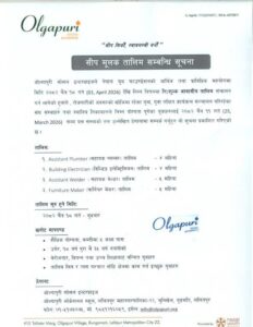 खान बस्न सुविधासहित ओल्गापुरी भोकेसनल स्कुलले ४ विधामा निशुल्क सीपमूलक तालिम खुलाएको छ । स्कुलले सहायक प्लम्बर, विल्डिङ इलेक्ट्रिसियन, असिस्टेन्ट वेल्डर र फर्निचर मेकर विधामा तालिम सञ्चालन गर्न लागेको हो । सहायक प्लम्बर, विल्डिङ इलेक्ट्रिसियनका लागि तालिम अवधि ४-४ महिनाको हुनेछ भने असिस्टेन्ट वेल्डर र फर्निचर मेकर पदका लागि भने ५-५ महिना तालिम सञ्चालन हुनेछ । जसमा तालिम पछि सम्बन्धित निकायमा १ ओजेटी (on the job training )  समावेश छ ।