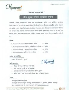 खान बस्न सुविधासहित ओल्गापुरी भोकेसनल स्कुलले ४ विधामा निशुल्क सीपमूलक तालिम खुलाएको छ । स्कुलले सहायक प्लम्बर, विल्डिङ इलेक्ट्रिसियन, असिस्टेन्ट वेल्डर र फर्निचर मेकर विधामा तालिम सञ्चालन गर्न लागेको हो । सहायक प्लम्बर, विल्डिङ इलेक्ट्रिसियनका लागि तालिम अवधि ४-४ महिनाको हुनेछ भने असिस्टेन्ट वेल्डर र फर्निचर मेकर पदका लागि भने ५-५ महिना तालिम सञ्चालन हुनेछ । जसमा तालिम पछि सम्बन्धित निकायमा १ ओजेटी (on the job training ) समावेश छ ।