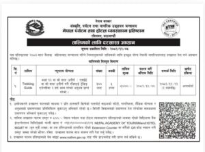 नेपाल पर्यटन तथा होटल व्यवस्थापन प्रतिष्ठान (NATHM) ले ट्रेकिङ गाइड तालिमका लागि आवेदन आह्वान गरेको छ। सूचना अनुसार २०८२ वैशाख महिनाबाट सञ्चालन हुने उक्त तालिममा सहभागी हुन इच्छुक नेपाली नागरिकले आवेदन दिन सक्नेछन्।