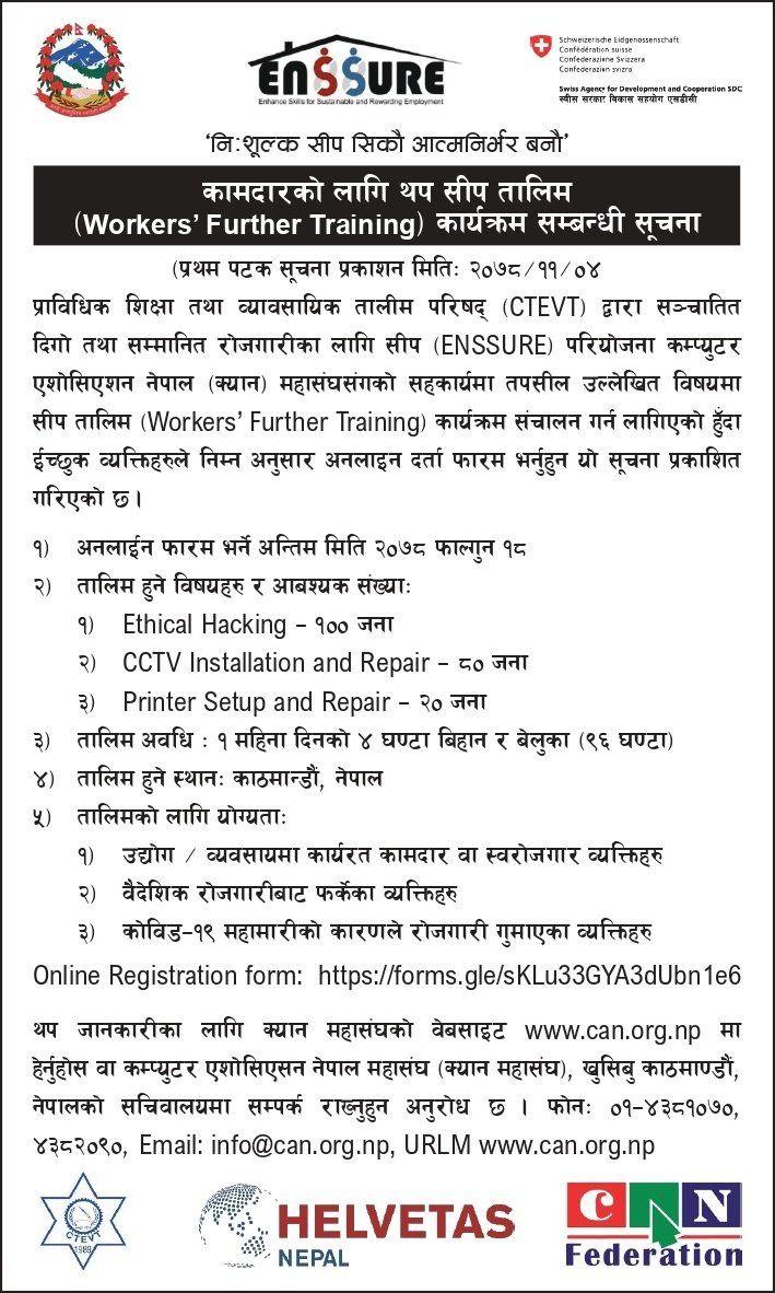 प्राविधिक शिक्षा तथा व्यावसायिक तालीम परिषद् (सीटीईभीटी) र कम्प्युटर एसोसिएसन नेपाल, महासंघ (क्यान) को सहकार्यमा उद्योग/व्यवसायमा कार्यरत कामदार वा स्वरोजगार व्यक्तिहरू, वैदेशिक रोजगारबाट फर्केका व्यक्तिहरू र कोभिड महामारीको कारणले रोजगार गुमाएका व्यक्तिहरूलाई निःशुल्क सूचना प्रविधि (आईटी) सम्बन्धी एक महिने तालिम आयोजना हुने भएको छ ।