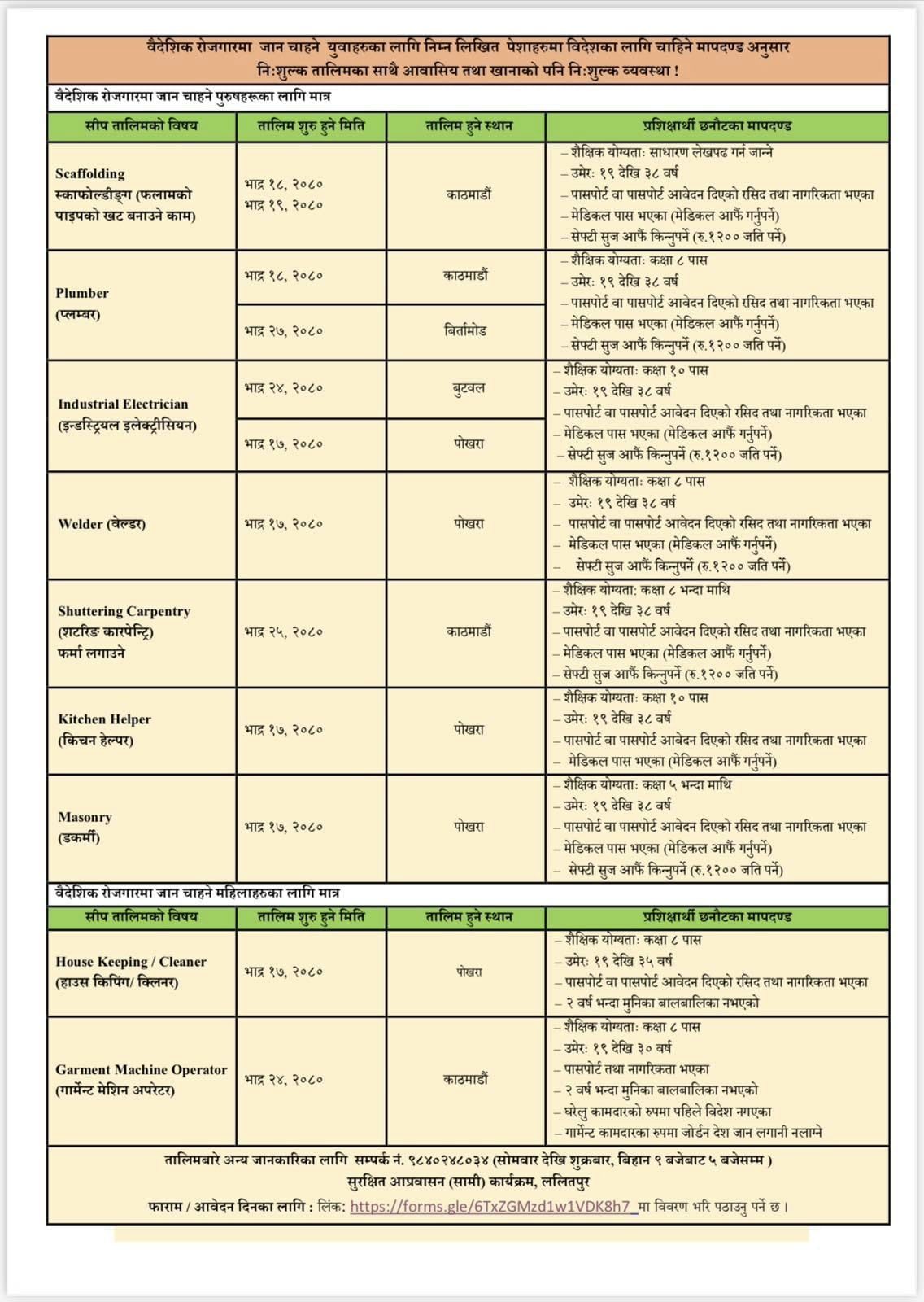 डकर्मी, किचन हेल्पर, पोखरमा सञ्चालन हुने वेल्डर सम्बन्धी तालिम, पोखरामा नै सञ्चालन हुने इन्डस्ट्रियल इलेक्ट्रीसियन तालिम र महिलाहरूका लागि हाउस किपिङ तालिम भदौ १७ गतेबाट सञ्चालन भइसकेको छ ।
